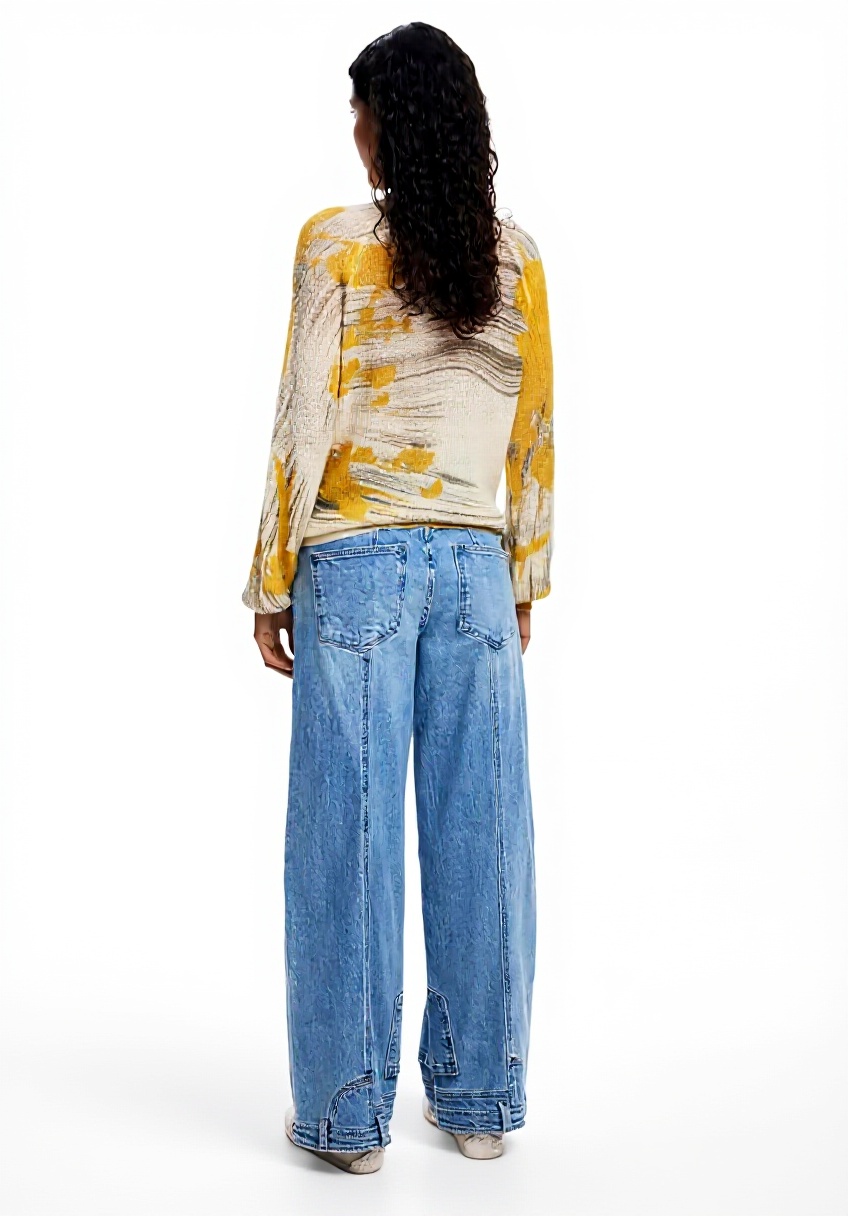 La stampa arty è il primo elemento che cattura l’attenzione – non si tratta di un pattern ripetitivo ma di un disegno che sembra raccontare una storia attraverso colori e forme. Il tessuto con texture aggiunge un’interessante dimensione tattile, percepibile al primo contatto con le mani. Il collo rotondo è tagliato in modo da non stringere eccessivamente, mentre le maniche lunghe mantengono una lunghezza standard che arriva fino al polso. Nella pratica quotidiana, si nota come la felpe mantenga la sua forma dopo diversi utilizzi, senza eccessivi allungamenti alle maniche o al torso.